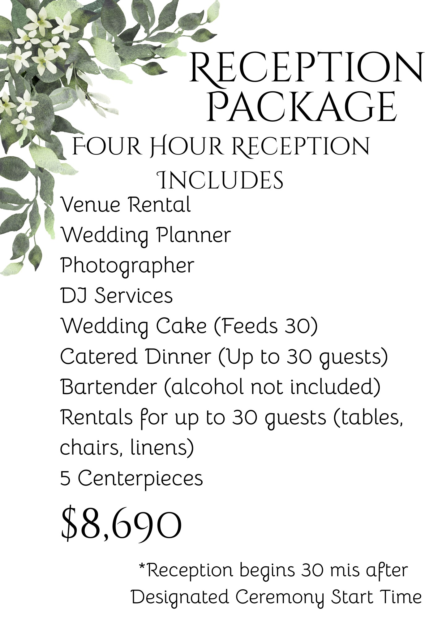 Reception price will be added on to ceremony pricing. This is all inclusive pricing with taxes and fees included. All packages as well as reception add-on are base packages with options for upgrades. All packages and reception add-ons are not able to be adjusted other than adding additions.
